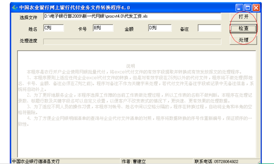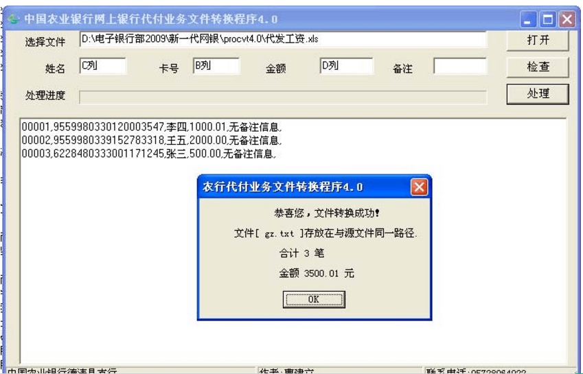 點擊“打開”按鈕,選擇EXCEL格式的工資表文件,點擊“檢查”按鈕,成功后點擊“處理”按鈕,程序會提示成功與否的信息,成功會產(chǎn)生TXT格式的工資表文件(文件名:gz.txt)。
