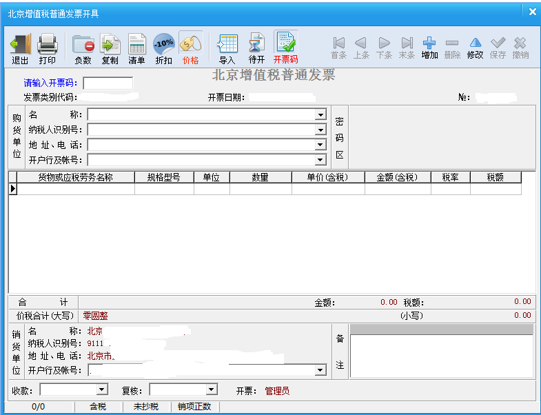 2、假如進入北京增值稅專用發(fā)票界面,我們是在普票填列的基礎上,再加填“地址、電話”、“開戶行及賬號”