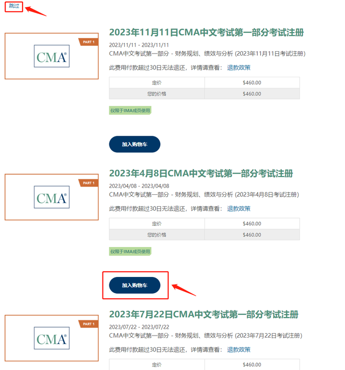 注冊(cè)一門考試,如果您想先參加第二部分考試,點(diǎn)擊頁(yè)面左上角“跳過(guò)”,添加第二部分考試費(fèi)