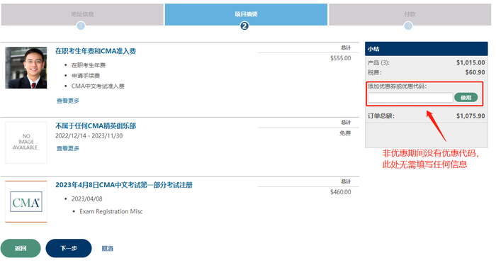 確認(rèn)購(gòu)買項(xiàng)目,優(yōu)惠期間可在右側(cè)輸入優(yōu)惠代碼, 點(diǎn)擊“使用”的按鈕,才能享受優(yōu)惠價(jià)格,確認(rèn)金額變化后點(diǎn)擊“下一步”。