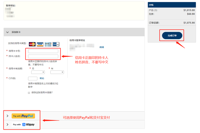 輸入visa或mastercard雙幣信用卡信息,紅色* 為必填項(xiàng),點(diǎn)擊“完成訂單”付款