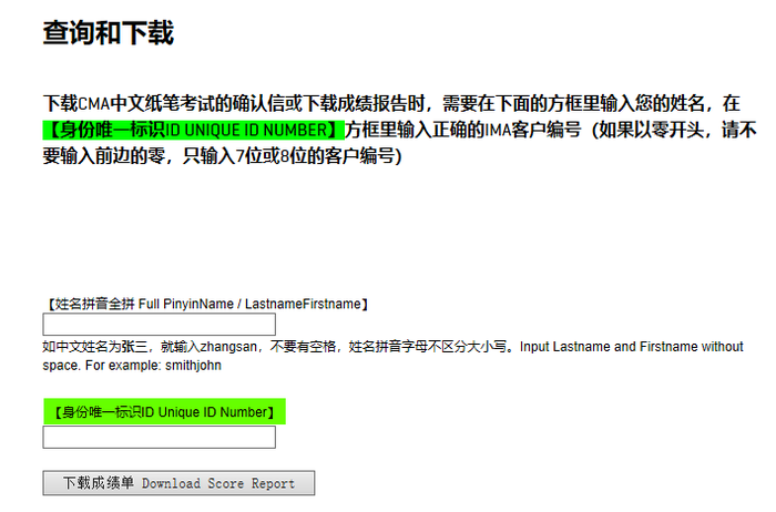 下載cma中文考試的確認(rèn)信或下載成績(jī)報(bào)告時(shí),需要在下面的方框里輸入考生姓名,在【身份唯一標(biāo)識(shí)ID Unique ID Number】方框里輸入正確的IMA客戶編號(hào)(如果以零開頭,請(qǐng)不要輸入前邊的零,只輸入7位或8位的客戶編號(hào))。