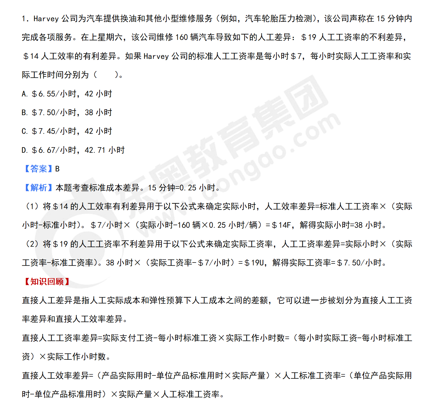 1.Harvey公司為汽車提供換油和其他小型維修服務(wù)(例如,汽車輪胎壓力檢測),該公司聲稱在15分鐘內(nèi)完成各項服務(wù)。在上星期六,該公司維修160輛汽車導(dǎo)致如下的人工差異:$19人工工資率的不利差異,$14人工效率的有利差異。如果Harvey公司的標(biāo)準(zhǔn)人工工資率是每小時$7,每小時實際人工工資率和實際工作時間分別為( )。