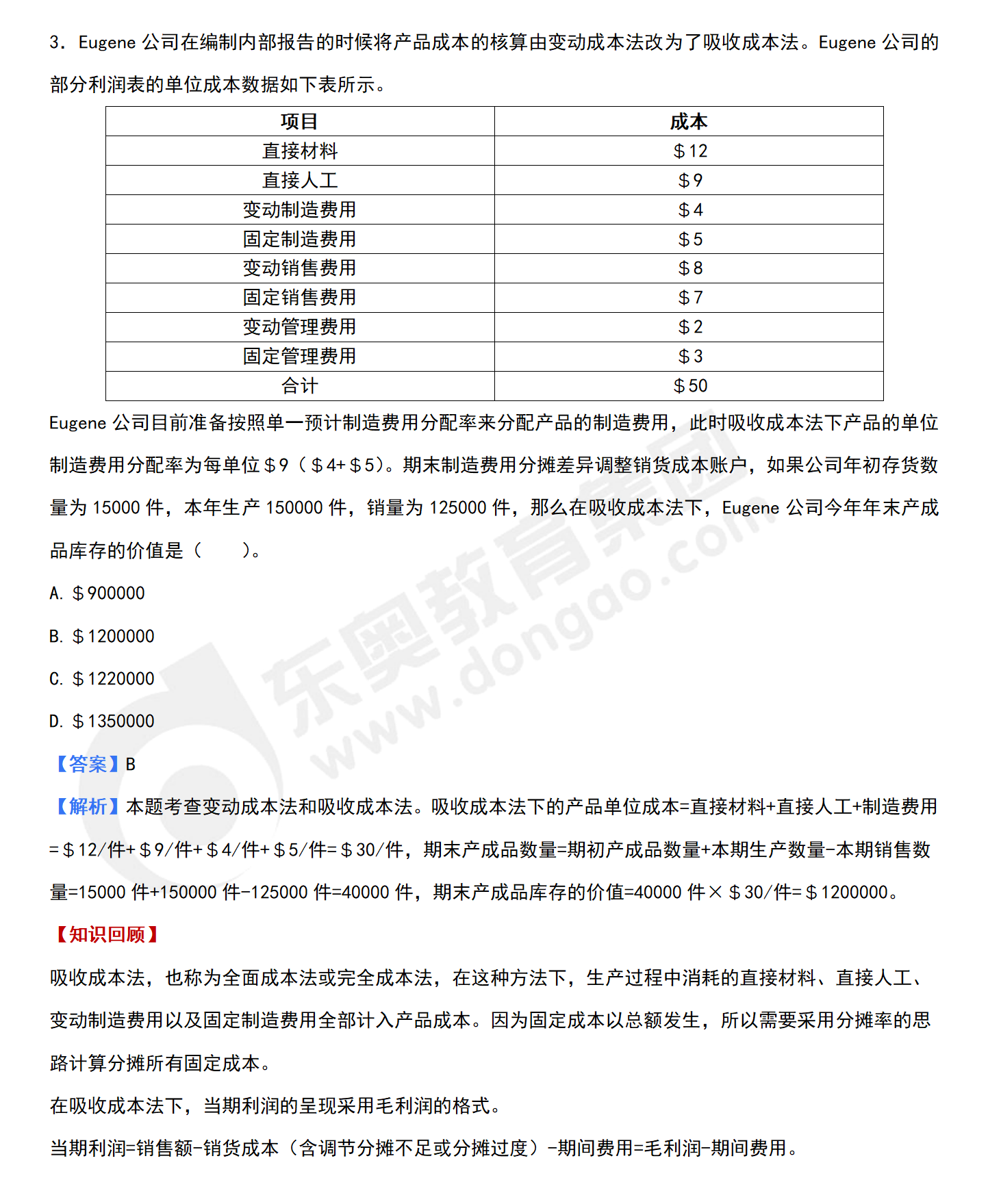 3.Eugene公司在編制內(nèi)部報告的時候?qū)a(chǎn)品成本的核算由變動成本法改為了吸收成本法。Eugene公司的部分利潤表的單位成本數(shù)據(jù)如下表所示。