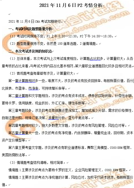 2021年11月份CMA考試P2部分已于11月6日18:30結(jié)束!參加考試的小伙伴們,你們發(fā)揮的如何呢?小編要在此預(yù)祝大家都能順利通過(guò)!為了讓大家更好的了解本次CMA考試P2部分的考情分析,特為大家?guī)?lái)了以下精彩內(nèi)容,如果你也好奇這次考試的難度,那就前來(lái)關(guān)注吧!
