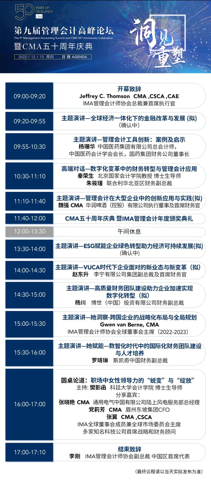 作為年度值得期待的管理會(huì)計(jì)盛事之一,第九屆管理會(huì)計(jì)高峰論壇暨CMA五十周年慶典將于2022年12月15日(周四)正式拉開(kāi)帷幕。自線上報(bào)名直播通道開(kāi)啟以來(lái),已受到廣泛關(guān)注,報(bào)名仍在火熱進(jìn)行中。本屆高峰論壇將圍繞“洞見(jiàn)與重塑”展開(kāi),眾多重量級(jí)大咖將齊聚一堂,共享智慧盛宴。CMA持證者完整參與更可以獲得8個(gè)CPE學(xué)分。
