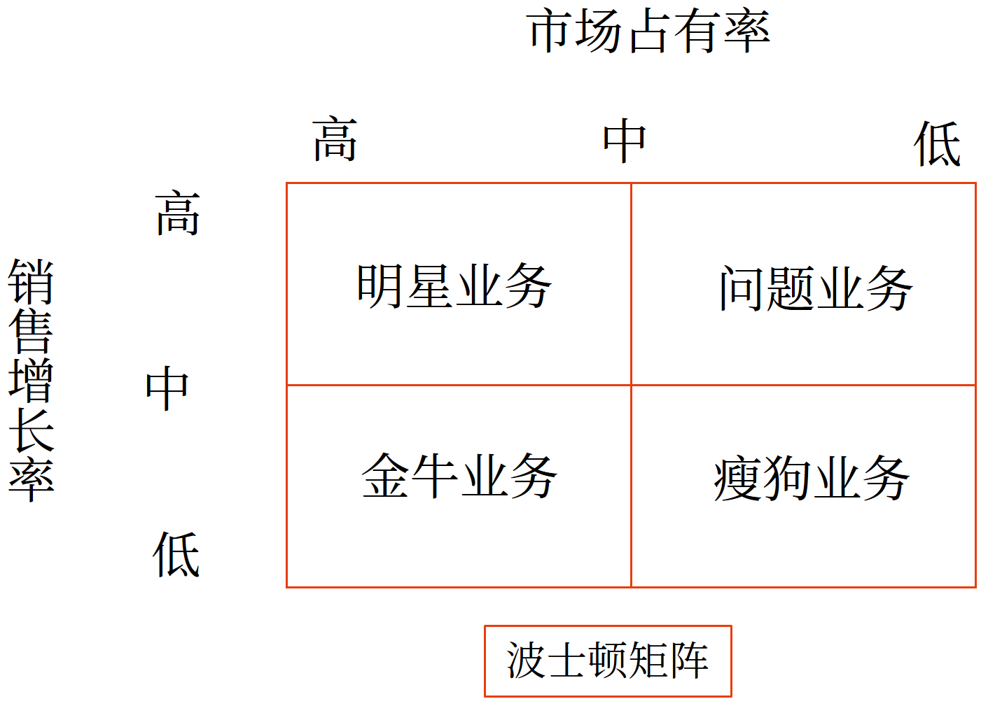 (1)波士頓矩陣是根據(jù)業(yè)務(wù)增長(zhǎng)率和市場(chǎng)占有率兩項(xiàng)指標(biāo),將企業(yè)所有的戰(zhàn)略單位分為“明星、問題、金牛、瘦狗”四大類,并以此分析企業(yè)產(chǎn)品或服務(wù)的競(jìng)爭(zhēng)力,為科學(xué)選擇企業(yè)戰(zhàn)略提供依據(jù)的一種投資組合分析方法。