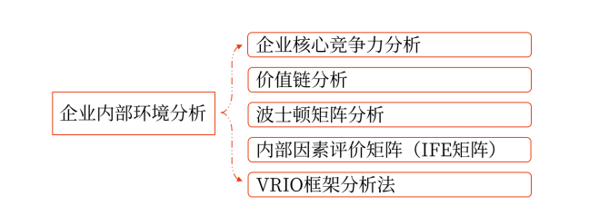 【解析】企業(yè)內(nèi)部環(huán)境分析的方法有企業(yè)核心競(jìng)爭(zhēng)力分析、價(jià)值鏈分析、波士頓矩陣分析、內(nèi)部因素評(píng)價(jià)矩陣、VRIO框架分析法。