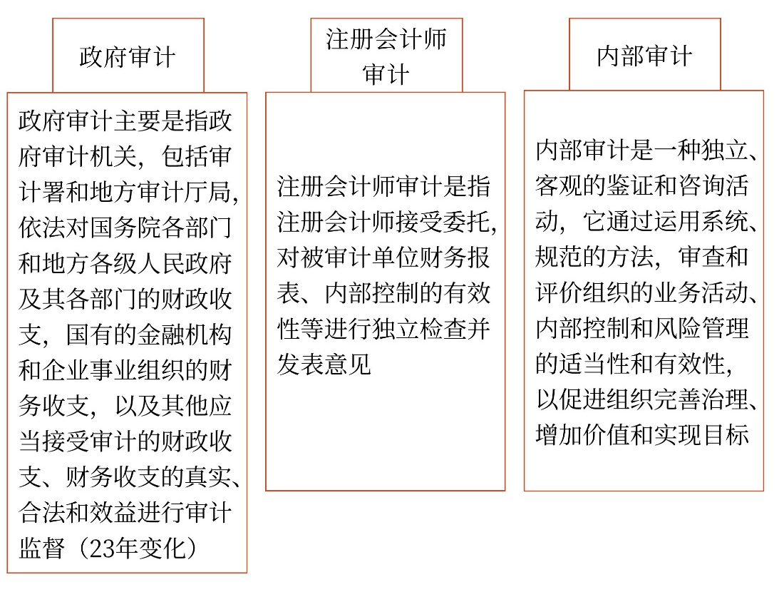 審計(jì)目標(biāo)和對(duì)象 | 對(duì)國務(wù)院各部門和地方各級(jí)人民政府及其各部門的財(cái)政收支,國有的金融機(jī)構(gòu)和企業(yè)事業(yè)組織的財(cái)務(wù)收支,以及其他應(yīng)當(dāng)接受審計(jì)的財(cái)政收支、財(cái)務(wù)收支的真實(shí)、合法和效益進(jìn)行審計(jì)監(jiān)督 | 對(duì)被審計(jì)單位財(cái)務(wù)報(bào)表、內(nèi)部控制的有效性等進(jìn)行獨(dú)立檢查并發(fā)表意見 | |