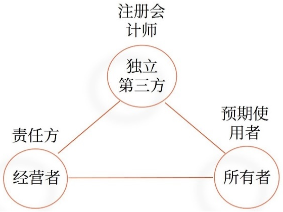 三方之間的關(guān)系是注冊會計師對由被審計單位管理層負責的財務報表發(fā)表審計意見,以增強除管理層之外的預期使用者對財務報表的信賴程度。