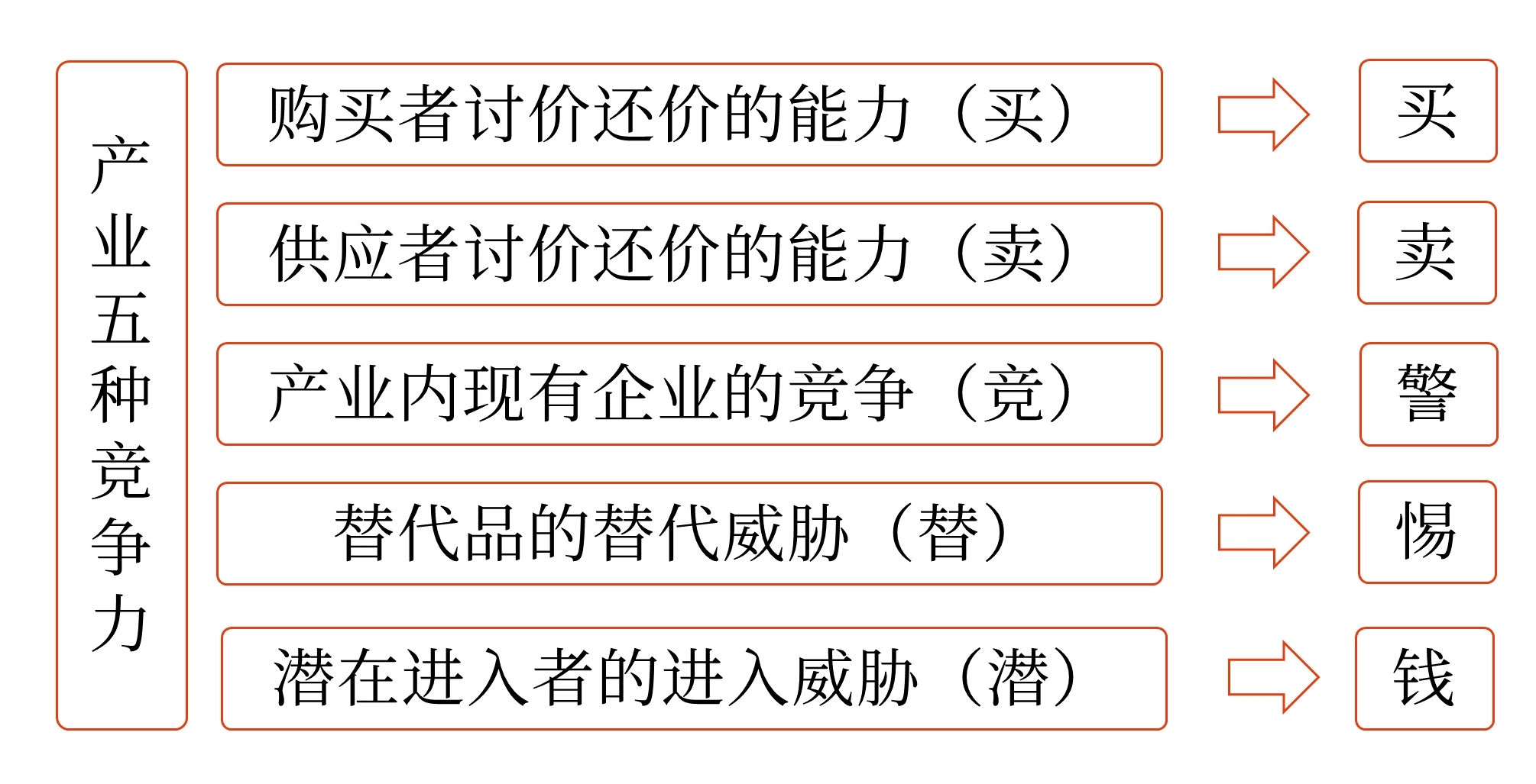 產(chǎn)業(yè)五種競(jìng)爭(zhēng)力一共五條,每一條我們抓一個(gè)關(guān)鍵字,串聯(lián)起來(lái)就是“買(mǎi)賣(mài)警惕錢(qián)”,意思是做買(mǎi)賣(mài)的時(shí)候要警惕自己的錢(qián),不要被別人騙了,這樣記憶就變得非常容易了。