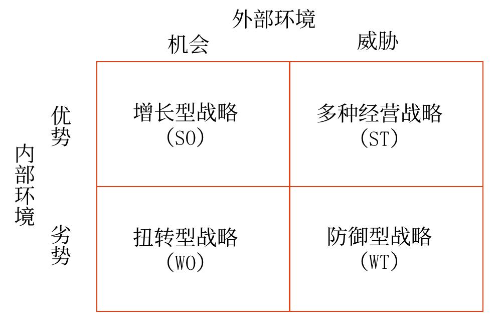 在對企業(yè)的內(nèi)外部環(huán)境分析之后,需要一個(gè)分析工具對上述分析內(nèi)容進(jìn)行綜合,這就是SWOT分析。SWOT分析是對企業(yè)的內(nèi)部條件和外部環(huán)境的各方面內(nèi)容進(jìn)行綜合概括,通過分析企業(yè)內(nèi)部的優(yōu)勢和劣勢及外部面臨的機(jī)會(huì)和威脅,進(jìn)而幫助企業(yè)進(jìn)行戰(zhàn)略選擇的一種方法。