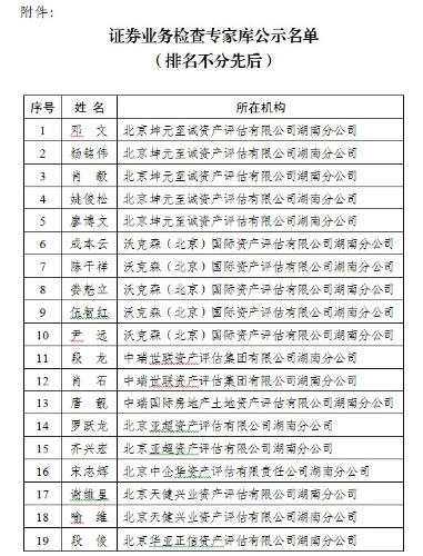 根據中國資產評估協(xié)會《關于建立證券業(yè)務檢查專家?guī)斓耐ㄖ?中評協(xié)辦〔2023〕41號)通知要求,湖南省資產評估協(xié)會擬組建證券業(yè)務檢查專家?guī)?。經本人申請、機構推薦以及協(xié)會審定程序,擬確定鄧文等19名資產評估師為湖南省資產評估協(xié)會證券業(yè)務檢查專家?guī)鞂<摇?/p>