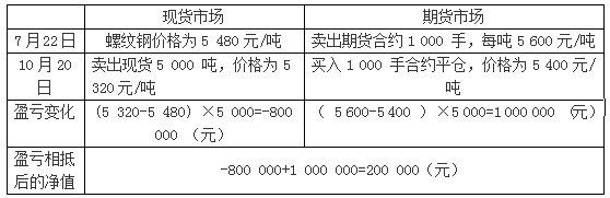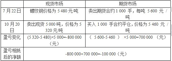 從盈虧情況來看,現(xiàn)貨價格的下跌導(dǎo)致甲集團損失了80萬元,但是由于其在期貨市場上的保值成功,在期貨市場上盈利了100萬元,綜合起來在螺紋價格下跌的不利局面下甲集團不僅成功規(guī)避了價格下跌的風(fēng)險,而且額外盈利20萬元。