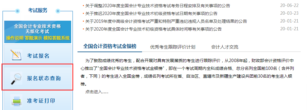 1.登陸全國會(huì)計(jì)資格評(píng)價(jià)網(wǎng)http://kzp.mof.gov.cn/,找到報(bào)名狀態(tài)查詢版塊