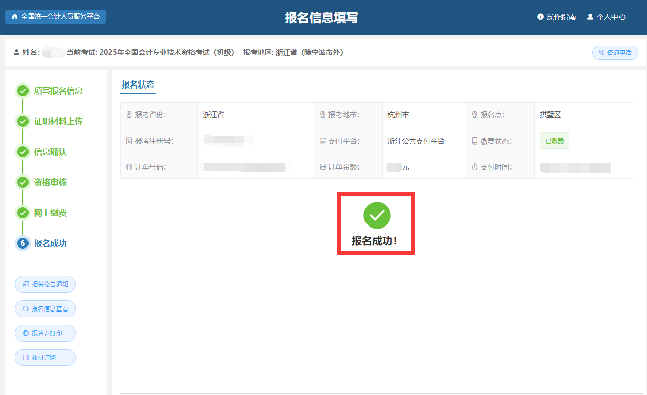 (2)已通過審核且未生成繳費(fèi)訂單的考生可以點(diǎn)右上角“重新報(bào)名”填寫資料并提交,等待屬地財(cái)政部門審核通過后,即可網(wǎng)上繳費(fèi)并完成報(bào)名。