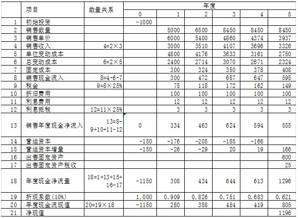 凈現(xiàn)值=-1 150×1+308×0.909+434×0.826+644×0.751+613×0.683+1 296×0.621=-1 150+280+358+484+419+805=1 196(萬元)