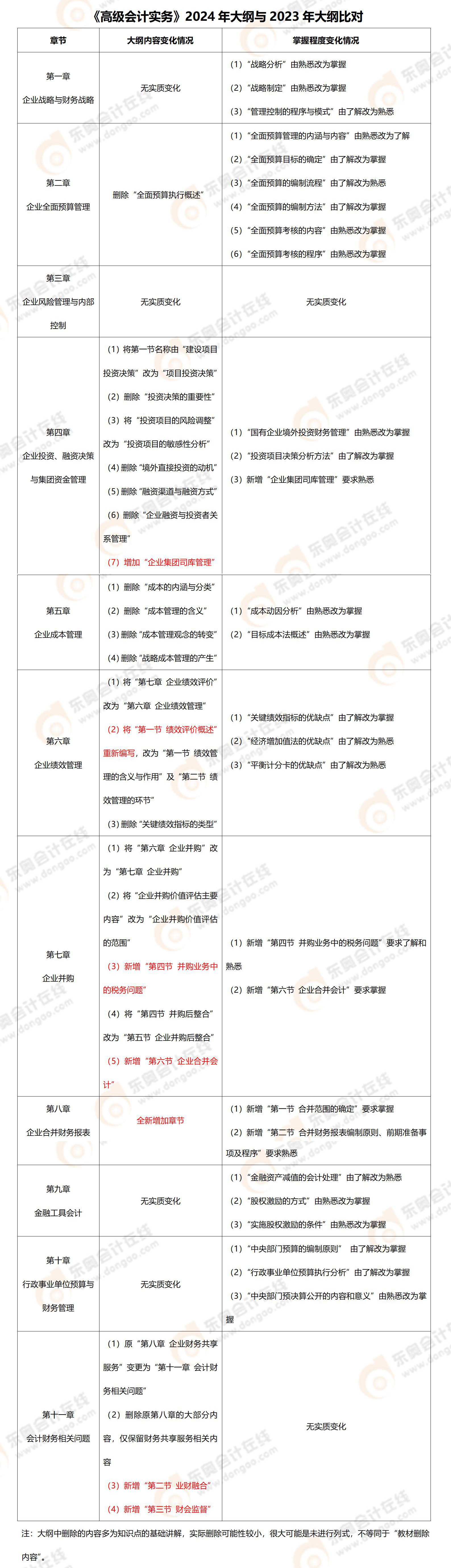2024年高級會計師考試大綱現(xiàn)已公布,高級會計師考試內(nèi)容發(fā)生了哪些變化?為方便考生備考,東奧會計在線教研團(tuán)隊將2024年《高級會計實務(wù)》大綱與2023年大綱作出比對,高會考生們別錯過,趕快來看!