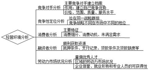 經(jīng)營(yíng)環(huán)境分析包括競(jìng)爭(zhēng)對(duì)手分析、競(jìng)爭(zhēng)性定位分析、消費(fèi)者分析、融資者分析、勞動(dòng)力市場(chǎng)狀況分析等。