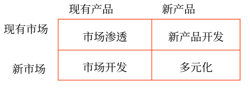 密集型成長(zhǎng)戰(zhàn)略具體類(lèi)型有:市場(chǎng)滲透、市場(chǎng)開(kāi)發(fā)(自己開(kāi)拓市場(chǎng))、新產(chǎn)品開(kāi)發(fā)(自己創(chuàng)新產(chǎn)品)。