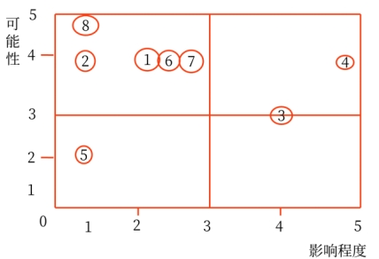 (3)確定風(fēng)險(xiǎn)重要性水平,分別將風(fēng)險(xiǎn)可能性和影響程度在風(fēng)險(xiǎn)矩陣中表示(橫軸表示風(fēng)險(xiǎn)影響程度,縱軸表示可能性),形成風(fēng)險(xiǎn)矩陣圖。如下圖所示,圖中1~8為事件。