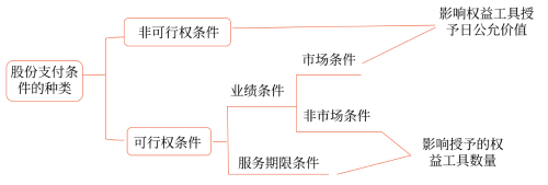 市場條件 | 指行權(quán)價格、可行權(quán)條件以及行權(quán)可能性與權(quán)益工具的市場價格相關(guān)的業(yè)績條件,如股份支付協(xié)議中關(guān)于股價至少上升至何種水平職工可相應取得多少股份的規(guī)定 |
