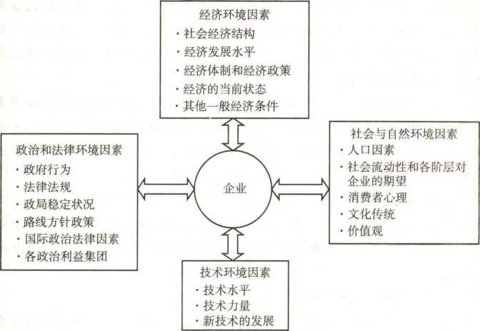 (1)政治和法律環(huán)境因素包括:制約和影響企業(yè)的政治因素;法律體系、法規(guī)及法律環(huán)境。