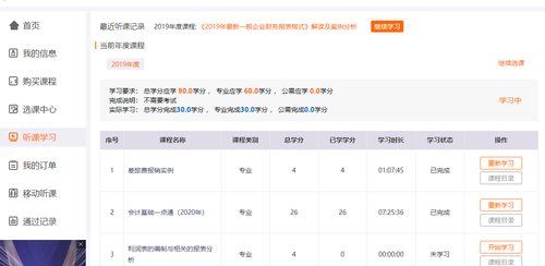 4. 聽課流程:選擇左側(cè)導(dǎo)航欄處聽課學(xué)習(xí),會出現(xiàn)所選的所有課程,如圖所示:若學(xué)員還未開始學(xué)習(xí)時,課程后面彩色字樣是“開始學(xué)習(xí)”;若是一節(jié)課程沒學(xué)完,會顯示“繼續(xù)學(xué)習(xí)”字樣;若是一節(jié)課程完全學(xué)習(xí)完成,相應(yīng)后面會顯示“重新學(xué)習(xí)”字樣,望學(xué)員周知。