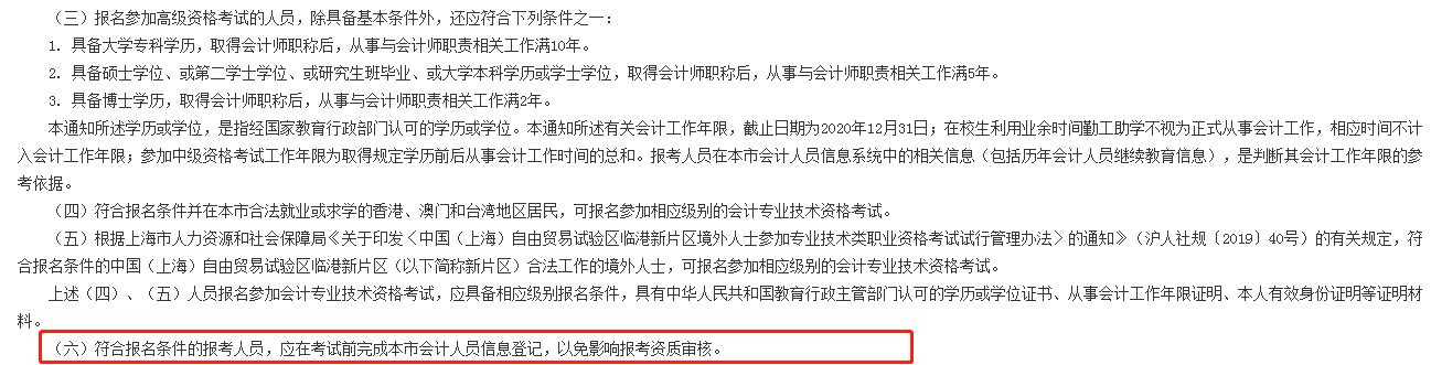 1.上海市在2020年會(huì)計(jì)專(zhuān)業(yè)技術(shù)中高級(jí)考試報(bào)名條件中提出,根據(jù)報(bào)考人員在本市會(huì)計(jì)人員信息系統(tǒng)中的相關(guān)信息(包括歷年會(huì)計(jì)人員繼續(xù)教育信息記錄)來(lái)判斷其會(huì)計(jì)工作年限的參考。