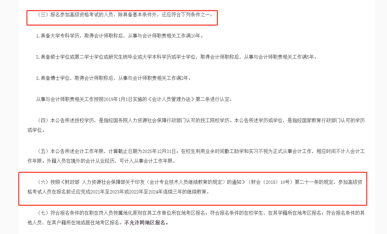 【江西】:“按照《財政部 人力資源社會保障部關(guān)于印發(fā)〈會計專業(yè)技術(shù)人員繼續(xù)教育的規(guī)定〉的通知》(財會〔2018〕10號)第二十一條的規(guī)定,參加高級資格考試人員在報名前還應(yīng)完成2021年至2023年或2022年至2024年連續(xù)三年的繼續(xù)教育。”