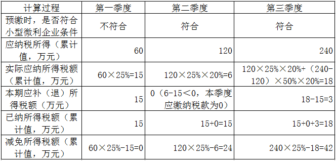 小李的公司第一季度不符合小型微利企業(yè)條件,且應(yīng)該納稅所得額為60萬元;第二季度符合小型微利企業(yè)條件,應(yīng)該納稅所得額為120萬元;第三季度符合小型微利企業(yè)條件,應(yīng)該納稅所得額為240萬元。則,小李公司三個(gè)季度企業(yè)所得稅應(yīng)納稅額如下: