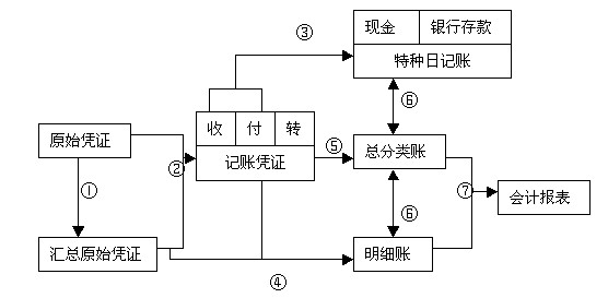 在記賬憑證賬務(wù)處理程序下,會計處理的一般程序包括以下七個基本步驟,如圖1所示(圖中的序號分別與基本步驟的序號對應(yīng))。