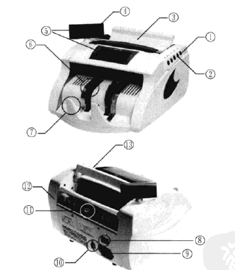 (1)復(fù)位;(2)請(qǐng)零;(3)滑鈔板;(4)指示燈;(5)顯示器;(6)接鈔輪;(7)擋鈔板;(8)外顯示插口;(9)電源插座 ;(10)電源開關(guān);(11)捻鈔調(diào)節(jié)螺絲 ;(12)磁性開關(guān);(13)吸塵器。