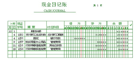 現(xiàn)金日記賬余額欄前未印有借貸方向,其余額方向默認為借方,余額欄用紅字登記,表示貸方余額。