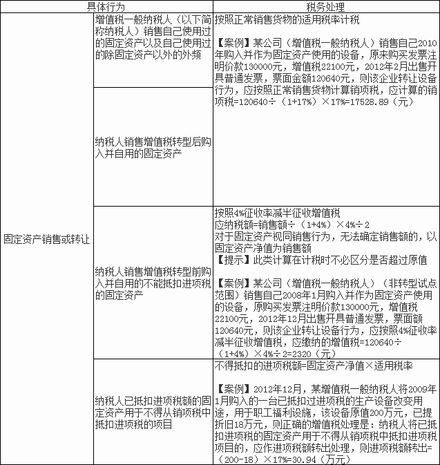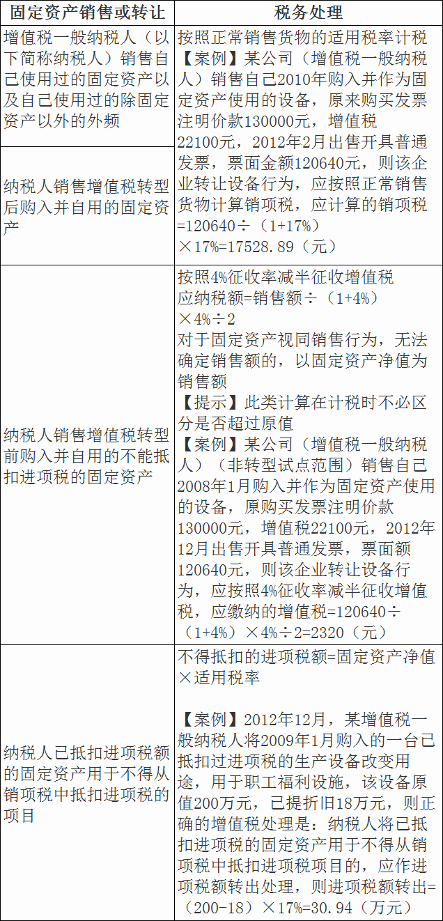 納稅人轉(zhuǎn)讓允許抵扣進(jìn)項(xiàng)稅的固定資產(chǎn)(有形動(dòng)產(chǎn)類固定資產(chǎn)),不論是否抵過(guò)進(jìn)項(xiàng),轉(zhuǎn)讓時(shí)按規(guī)定稅率計(jì)算銷項(xiàng)稅;納稅人轉(zhuǎn)讓不允許抵扣進(jìn)項(xiàng)稅的固定資產(chǎn)(有形動(dòng)產(chǎn)類固定資產(chǎn)),轉(zhuǎn)讓時(shí)按照4%征收率計(jì)算增值稅再減半。