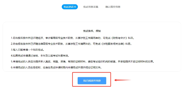步驟三:閱讀免試承諾書,點擊“我已閱讀并同意”;