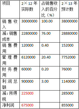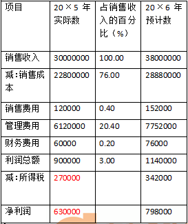 若該企業(yè)2×13年度預(yù)計銷售額為38000000元,則20×6年度預(yù)計利潤表可測算如表3-2所示。 | |