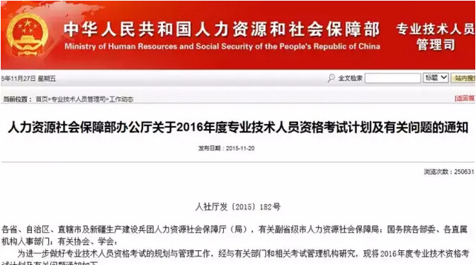 人力資源社會(huì)保障部辦公廳關(guān)于2016年度專業(yè)技術(shù)人員資格考試計(jì)劃及有關(guān)問題的通知
