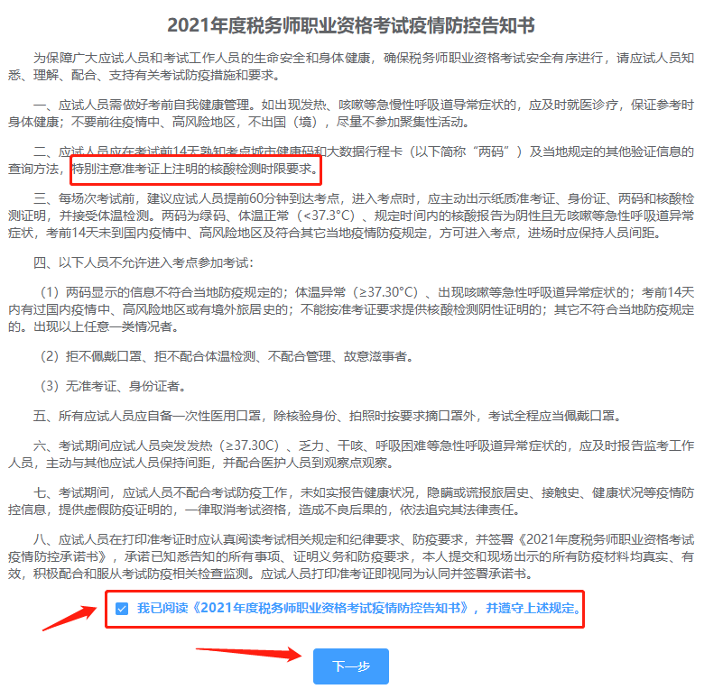 4.點擊打印按鈕后,即可彈出疫情防控告知書,告知書中顯示需“特別注意準(zhǔn)考證上著名的核酸檢測時限要求”仔細閱讀“2021年度稅務(wù)師職業(yè)資格考試疫情防控告知書”按照告知書中的要求進行準(zhǔn)備,方可參加稅務(wù)師考試。閱讀完成后勾選“我已閱讀《2021年度稅務(wù)師職業(yè)資格考試疫情防控告知書》,并遵守上述規(guī)定”,點擊“下一步”。