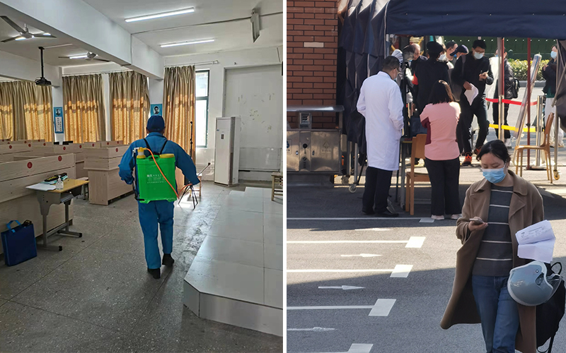 左圖為專業(yè)人員為考場(chǎng)消毒 ;右圖為考生們持48小時(shí)核酸檢測(cè)報(bào)告依次進(jìn)入考場(chǎng)