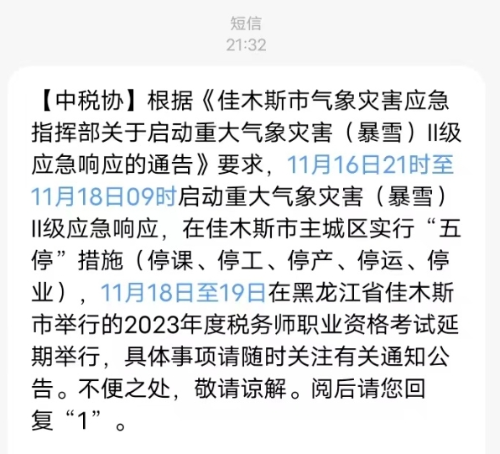 受極端天氣影響,根據(jù)《佳木斯市氣象災(zāi)害應(yīng)急指揮部關(guān)于啟動重大氣象災(zāi)害(暴雪)II級應(yīng)急響應(yīng)的通告》,佳木斯市主城區(qū)實(shí)行“五?!贝胧ㄍUn、停工、停產(chǎn)、停運(yùn)、停業(yè)),為保障應(yīng)試人員安全,經(jīng)研究,決定延期舉行原定于11月18日至19日的2023年度(佳木斯市)稅務(wù)師職業(yè)資格考試。具體考試日期另行公告。