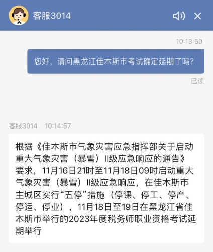 根據(jù)最新消息,黑龍江省佳木斯市原定于11月18-19日舉行的稅務(wù)師考試,因暴雪原因延期舉行,具體事宜及官方回復(fù)內(nèi)容,請看下文,并及時(shí)關(guān)注通知公告!