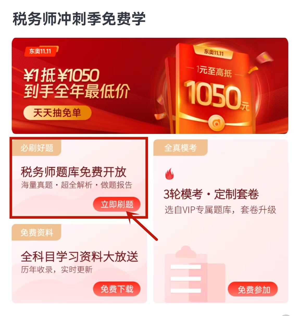 在稅務(wù)師頻道首頁找到稅務(wù)師沖刺季免費(fèi)學(xué)板塊,點(diǎn)擊「立即刷題」
