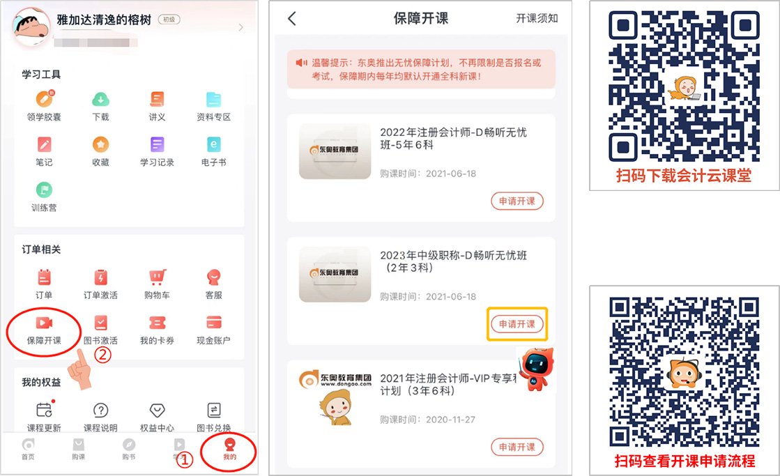 登錄【會(huì)計(jì)云課堂】→右下角“我的”→“訂單相關(guān)”→“保障開課”→“申請(qǐng)開課”,人臉識(shí)別成功后,可開通2024考季課程: