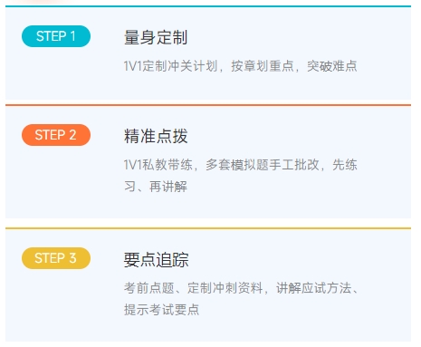 全過(guò)程從備考學(xué)習(xí)效果出發(fā),1V1專(zhuān)項(xiàng)輔導(dǎo),從帶學(xué)、帶練、答疑、沖刺四個(gè)方面貫穿整個(gè)備考過(guò)程。