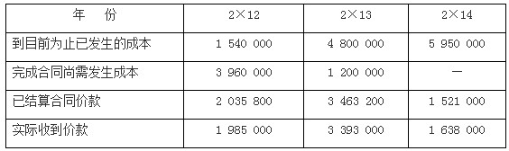某造船企業(yè)為增值稅一般納稅人,適用增值稅率17%。2×12年1月,企業(yè)與一客戶簽訂了一項總額為6 786 000元(含增值稅)的固定造價合同,承建一艘船舶。工程已于2×12年2月開工,預(yù)計2×14年8月完工。最初,預(yù)計工程總成本為5 500 000元;至2×13年底,由于鋼材價格上漲等因素調(diào)整了預(yù)計總成本,預(yù)計工程總成本已達(dá)到6 000 000元。該造船企業(yè)于2×14年6月提前兩個月完成了合同,工程優(yōu)良,客戶同意支付獎勵款234 000元(含增值稅)。建造該船舶的其他有關(guān)資料如表16-3所示(不考慮其他相關(guān)稅費)。