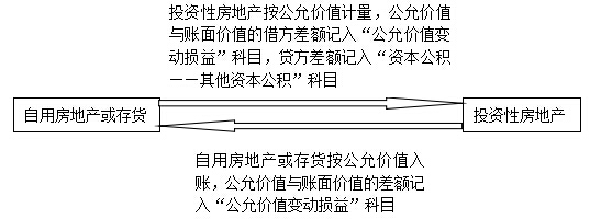 投資性產(chǎn)房地采用公允價(jià)值計(jì)量模式的房地產(chǎn)轉(zhuǎn)換如下圖所示: