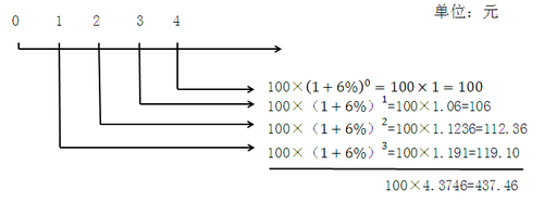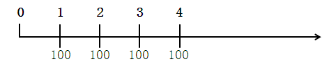 【例題】某投資者在未來4年,每年年末存入銀行100元,銀行年利息率是6%,計(jì)算第四年年末的本利和?(時(shí)間價(jià)值線)
