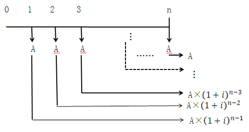 根據(jù)復(fù)利終值的計(jì)算公式,將每期期末存入的年金A復(fù)利到第n期期末,然后再相加,求出F: