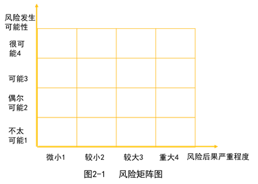 <2>企業(yè)可根據(jù)風(fēng)險(xiǎn)管理精度的需要,確定定性、半定量或定量指標(biāo)來描述風(fēng)險(xiǎn)后果嚴(yán)重程度和風(fēng)險(xiǎn)發(fā)生可能性。風(fēng)險(xiǎn)后果嚴(yán)重程度的橫坐標(biāo)等級(jí)可定性描述為“微小”“較小”“較大”“重大”等(也可采用1、2、3、4等M個(gè)半定量分值),風(fēng)險(xiǎn)發(fā)生可能性的縱坐標(biāo)等級(jí)可定性描述為“不太可能”“偶爾可能”“可能”“很可能”等(也可采用1、2、3、4等N個(gè)半定量分值),從而形成M×N個(gè)方格區(qū)域的風(fēng)險(xiǎn)矩陣圖(見圖2-1),也可以根據(jù)需要通過定量指標(biāo)更精確地描述風(fēng)險(xiǎn)后果嚴(yán)重程度和風(fēng)險(xiǎn)發(fā)生可能性。
